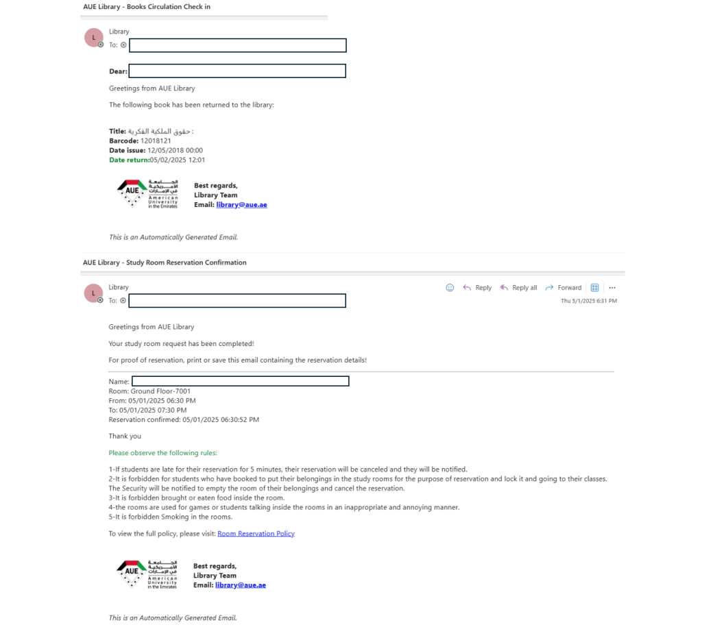 To further enhance our service experience, the AUE Library has introduced automated email notifications for key library activities, including check-ins, check-outs, and study room bookings. This new feature ensures that users receive timely updates and confirmations directly in their inbox, promoting better awareness and management of their library interactions.